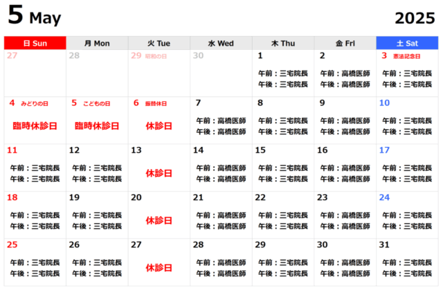 5月の外来担当医のお知らせ 2025.5.9 未分類 5月の外来担当医をお知らせいたします。不定期に担当医が変わることもございますが、 ご理解の程、宜しくお願い申し上げます。 前の記事へ 一覧へ戻る 次の記事へ