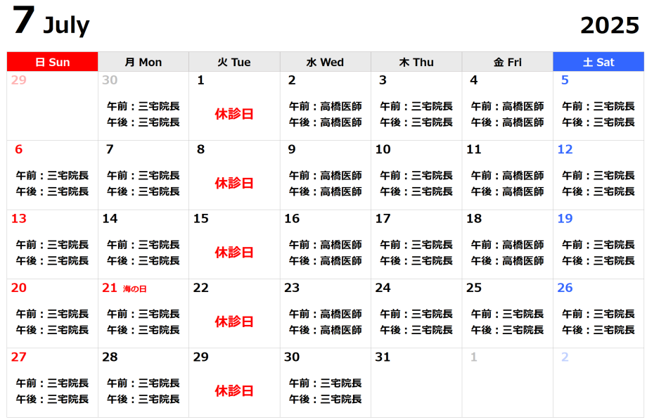 7月の外来担当医のお知らせ 2025.6.28 未分類 7月の外来担当医をお知らせいたします。7月25日と7月30日は高橋医師から三宅院長へ変更になります。不定期に担当医が変わることもございますが、 ご理解の程、宜しくお願い申し上げます。 前の記事へ 一覧へ戻る 次の記事へ